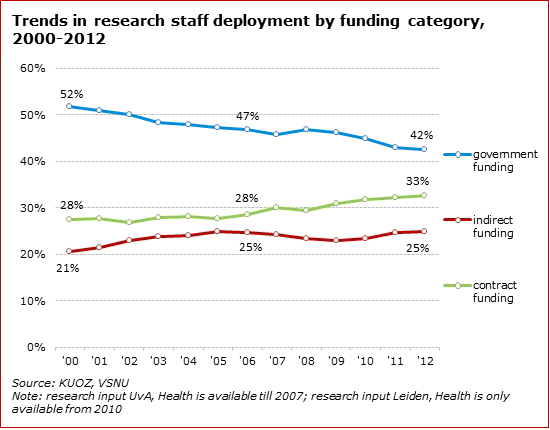 Although direct government funding has dropped in recent years, university income from indirect government funding and contract research funding has increased. Universities are becoming more and more dependent on these sources of income for their staff deployment (and therefore also for their scientific output).